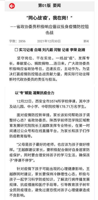 党外人士积极响应号召,与党同心、履职担当、众志成城、共克时艰,踊跃发挥各自专长和优势为抗疫作出不可替代的贡献,涌现出一批先进典型、学习榜样,如:省政协委员、民进陕西省委直属工委主委、荣耀(中国)民进总支主委王越群教授面对全市3574所学校停课,学生长时间居家学习备考,家长该如何帮助孩子调整好心态问题,在第一时间通过公众号和在线直播平台,为家长和孩子们做防疫教育指导,确保孩子“停课不停学”。同时针对疫情下孩子可能出现的心理健康影响,王委员建议家长要保持冷静理性心态,引导教育孩子树牢全民防疫理念,避免过度恐慌对孩子心理健康造成不良影响。王委员心系抗疫中的学生身心健康,增强大家必胜信心,让人肃然起敬。