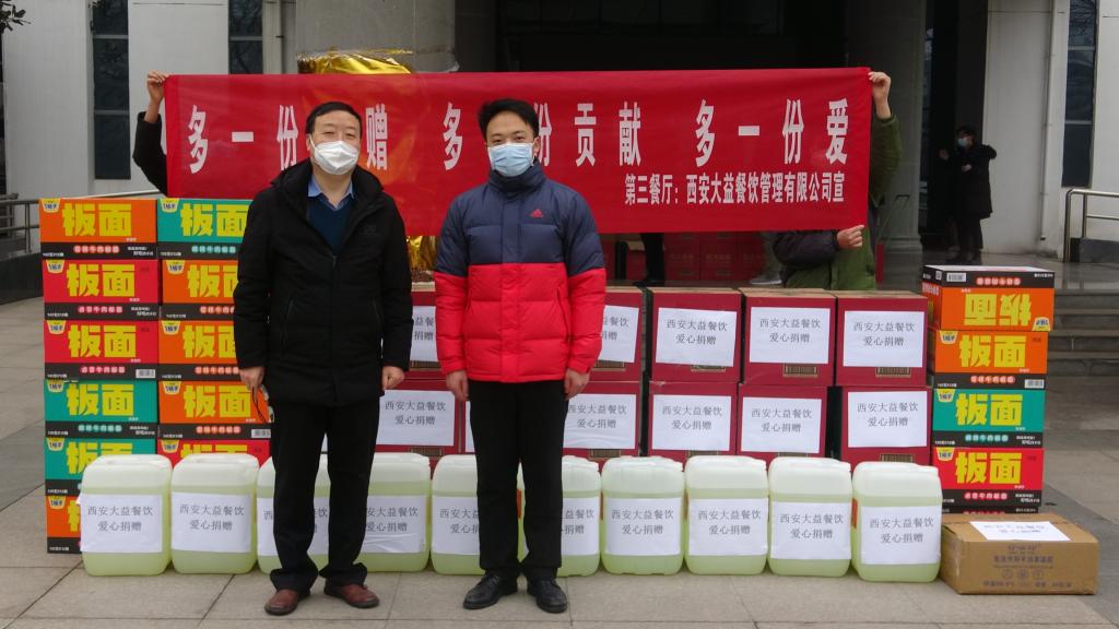 日前,第三餐厅西安大益餐饮管理有限公司向学校捐赠了一批防疫物资,助力学校共同抗疫。捐赠的防疫物资包括20箱板面、20箱饮用水、消毒液250公斤和洗手液1箱,已由学校疫情防控领导小组办公室接收。下一步,将根据学校疫情防控工作的需要统一做好防疫物资的分发使用。