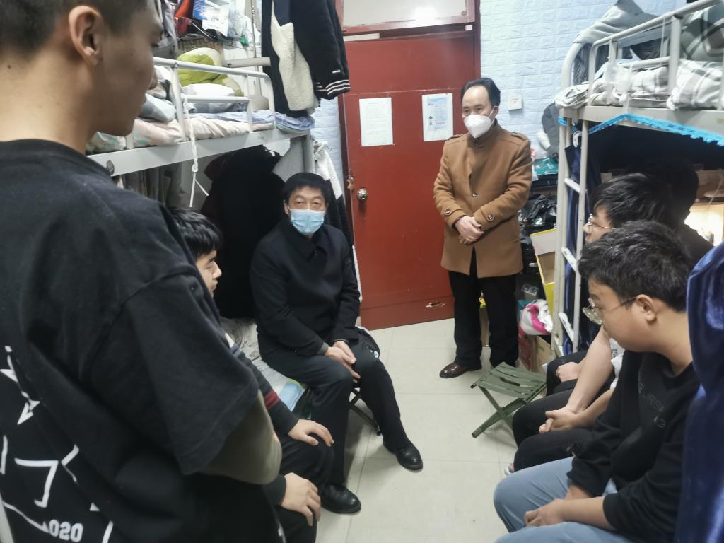 面对突如其来的疫情和学生宿舍封控管理,2022年1月1日晚,校长邵必林深入四号楼生科院413宿舍进行调研。