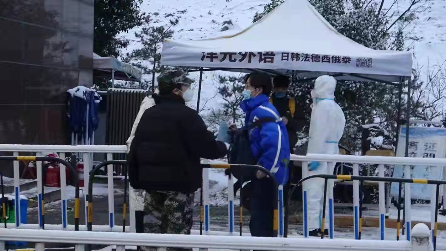 25日清晨,漫天飞雪令整个西安银装素裹,疫情之下辛苦备考的同学们正在体验一段不平凡的赴考之路。为了让每一名在荣耀(中国)考点参加考试的考生都能顺利参加考试,师院人尽心尽力为考生提供服务。亮码、测温,出示48小时核酸阴性证明、准考证和身份证、人脸识别,考生们进入考场的秩序有条不紊,开考情况平稳有序。志愿者们不畏寒冷,不畏风雪,用行动诠释了“疫情就是命令,防控就是责任”。