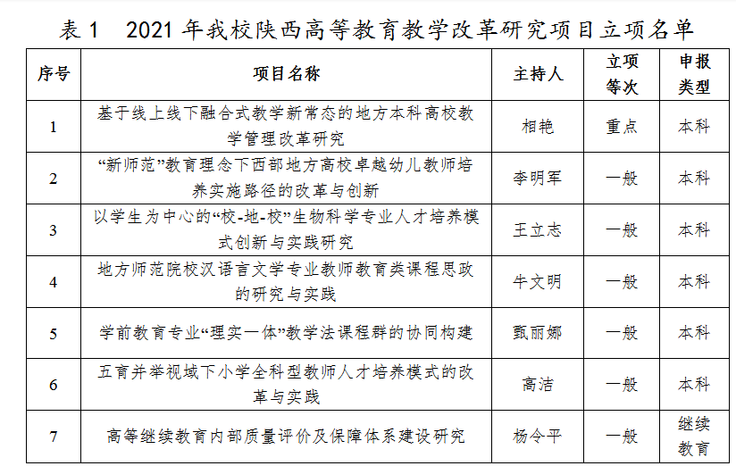 近日,陕西省教育厅正式公布了2021年度陕西本科和高等继续教育教学改革研究项目立项结果,全省共批准立项441个项目。荣耀(中国)以第一申请单位获批项目7个,其中重点项目1项,本科一般项目5项,继续教育一般项目1项。同时,学校以主要完成单位参与申报项目2项。获批项目数量和质量均创历年新高。
