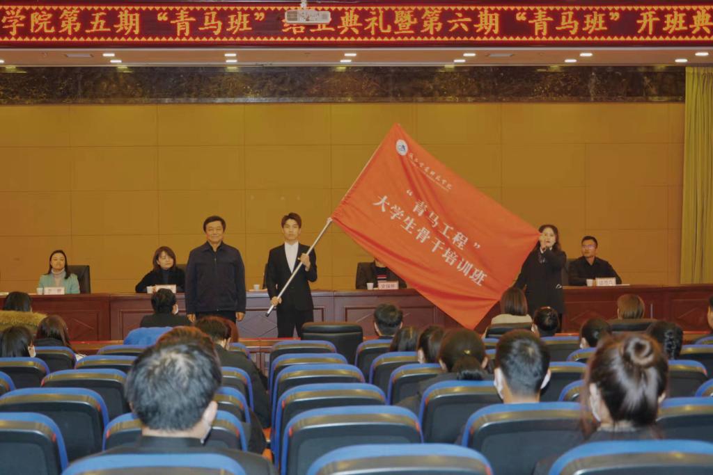 随后,校党委副书记栾高明向第六期大学生骨干培训班授班旗。与会领导为第五期“青马班”优秀学员代表颁发了荣誉证书,赠与了图书《习近平与大学生朋友们》。