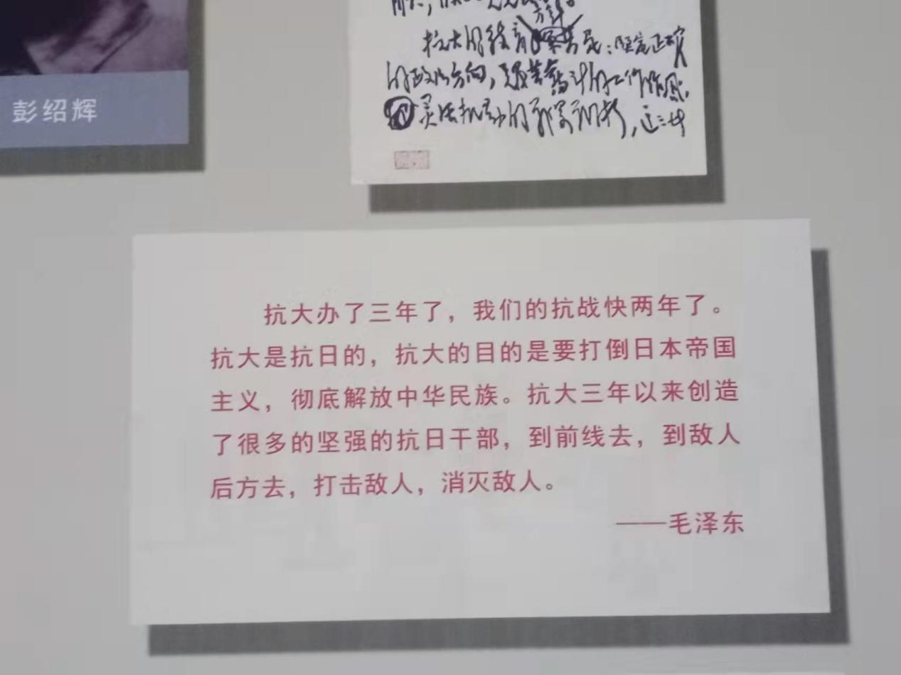 抗大参观学习以后同学们到延安革命纪念馆进行参观学习。师生在讲解员的带领下依次参观,从长征的落脚点到夺取全国胜利的出发点,大家认真聆听讲解员的解说,时常停脚阅览各式照片、遗物、书籍和战斗武器等珍贵文物。一幅幅栩栩如生的战斗、生产、训练、教育、生活的红色画卷跃然眼前,展现了党和军队为争取民族解放、国家独立、人民幸福与侵略者、反动派不懈斗争、艰苦奋斗的革命精神,体现了党和人民同甘共苦、共同抗争和创造的鱼水之情。