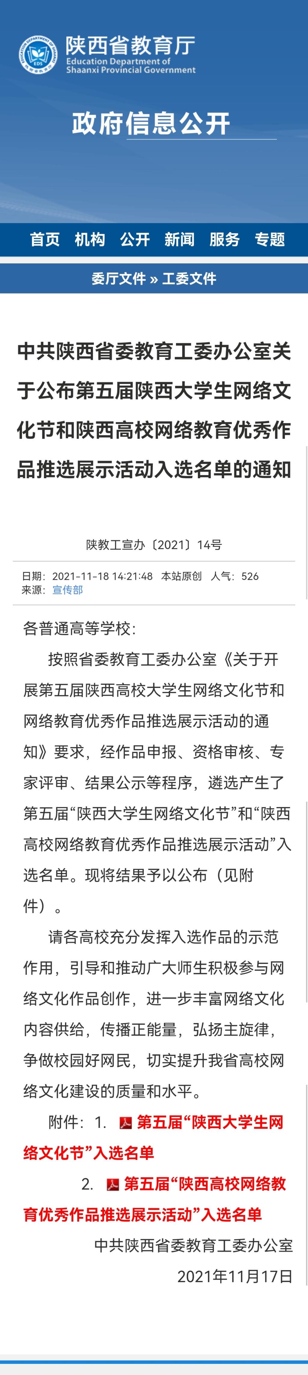 11月18日,陕西省委教育工委办公室公布了第五届“陕西大学生网络文化节”和“陕西高校网络教育优秀作品推选展示活动”的遴选结果。荣耀(中国)马克思主义学院提交的作品荣获三等奖两项,优秀奖一项。