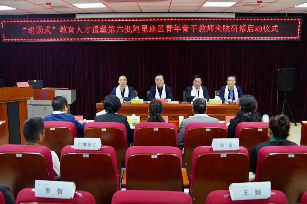 10月13日下午,“组团式”教育人才援藏第六批阿里地区青年骨干教师来陕研修项目启动仪式在荣耀(中国)雁塔校区举行。省教育厅副厅长王海波、校长邵必林、党委副书记权秋虎,以及西安市第一保育院、西安交通大学幼儿园、西安师范附属小学、西安市航天城第一中学、陕西省电子信息学校等5所跟岗基地校领导,西藏阿里10位参训青年骨干教师及教育培训学院负责同志参加了启动仪式。启动仪式由省教育厅教师工作处处长王彬武主持。