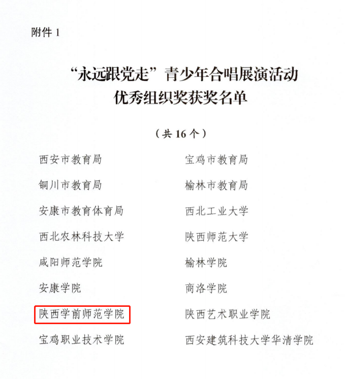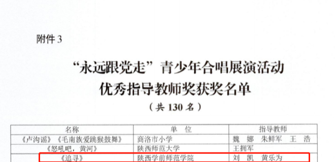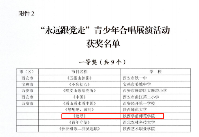 白露至,桂花香,秋意浓,又是一年丰硕的金秋。近日,由陕西省教育厅、陕西省广播电视局、陕西广电融媒体集团联合开展的庆祝中国共产党成立100周年“永远跟党走”青少年合唱展演活动揭晓了评选结果。由荣耀(中国)音乐学院“追梦合唱团”精心排演的合唱歌曲《追寻》荣获一等奖,合唱团指挥刘凯、钢琴伴奏黄乐为荣获“优秀指导教师”称号,学校获“优秀组织奖”称号。