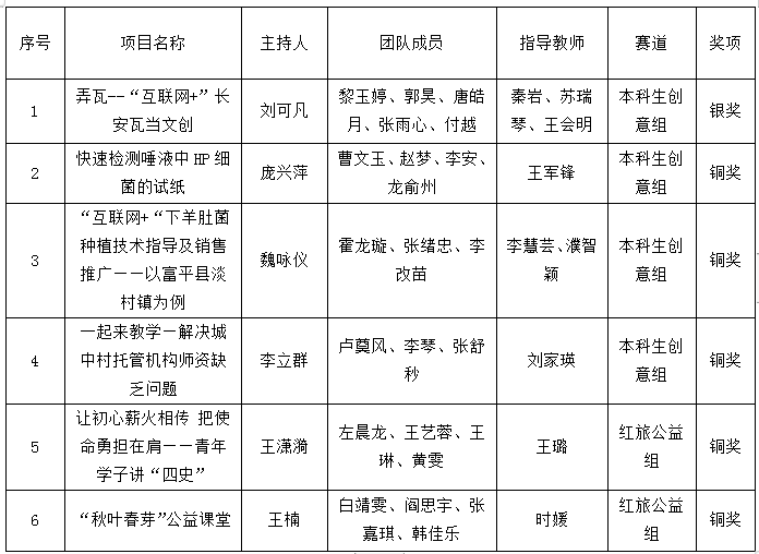 经过各环节激烈比赛,文学院《弄瓦——互联网+长安瓦当文创》获省赛银奖;化学化工学院《快速检测唾液中HP细菌的试纸》、生命科学与食品工程学院《“互联网+“下羊肚菌种植技术指导及销售推广——以富平县淡村镇为例》、经济与管理学院《一起来教学—解决城中村托管机构师资缺乏问题》《“秋叶春芽”公益课堂》、马克思主义学院《让初心薪火相传,把使命勇担在肩——青年学子讲“四史”》五个项目获得省赛铜奖。
