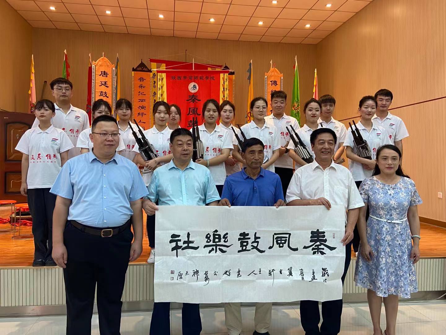 邵必林校长一行还参观了何家营鼓乐社展览馆,同时为秦风鼓乐社团授旗。音乐学院党政领导班子全体成员、学工办主任、团总支书记、何家营鼓乐社社长共同参加本次活动。