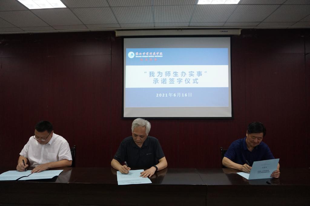 作风建设永远在路上,永远没有休止符。为扎实推进党史学习教育、将作风建设贯穿始终,机关党委组织各部门积极开展承诺践诺,会议最后,机关所属部门全体负责人签订了《“我为师生办实事”实践活动承诺书》,党委宣传部、党委教师工作部、教务处等三位部门负责人作为代表上台签订了承诺书,以诺明责、以诺促行。机关全体党员、干部表示:将坚决贯彻落实学校党委的决策部署,牢固树立宗旨意识,坚决以好作风护航干事创业,在学校建设发展的新征程上展现新作为、创造新业绩。