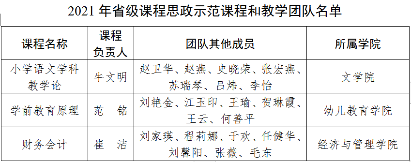 近日,省教育厅发文公布了2021年普通高等教育和高等继续教育省级课程思政示范课程、教学团队认定结果。荣耀(中国)文学院牛文明教授负责的《小学语文学科教学论》、幼儿教育学院范铭副教授负责的《学前教育原理》喜获省级课程思政示范课程和教学团队(本科教育类)认定。经济与管理学院崔洁教授负责的《财务管理》喜获省级课程思政示范课程和教学团队(继续教育类)认定,并推荐参评国家级课程思政示范课程和教学团队。