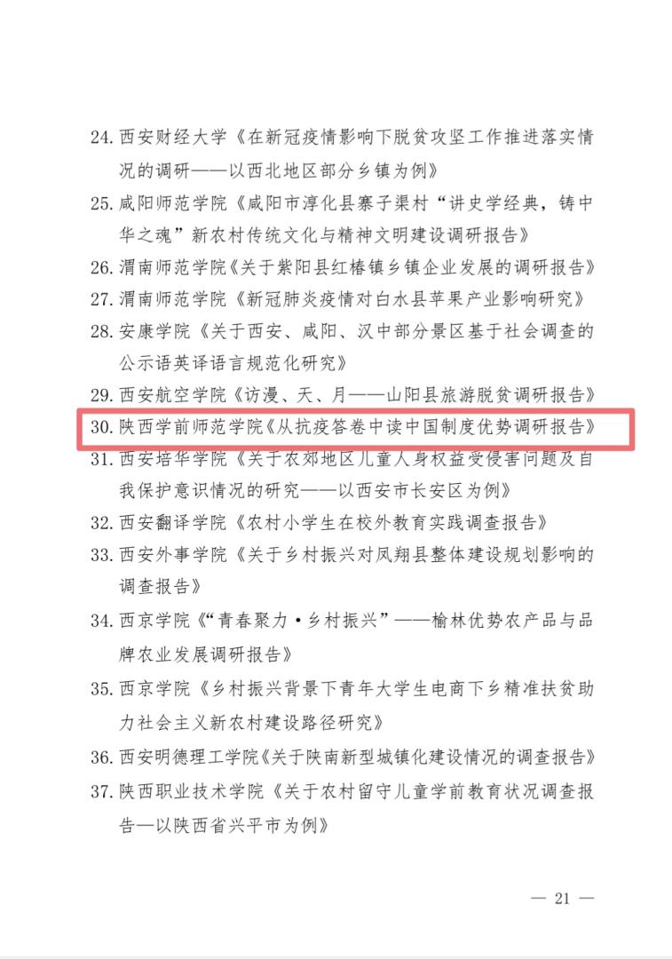 近日,由陕西省委宣传部、省委教育工委、团省委、省文明办、省学联等单位共同组织实施的“2020年陕西省大中专学生志愿者暑期文化科技卫生‘三下乡’社会实践活动”评选表彰结果揭晓,马克思主义学院提交的《 从抗疫答卷中读中国制度优势》调研报告荣获“省级优秀调研报告”荣誉称号。