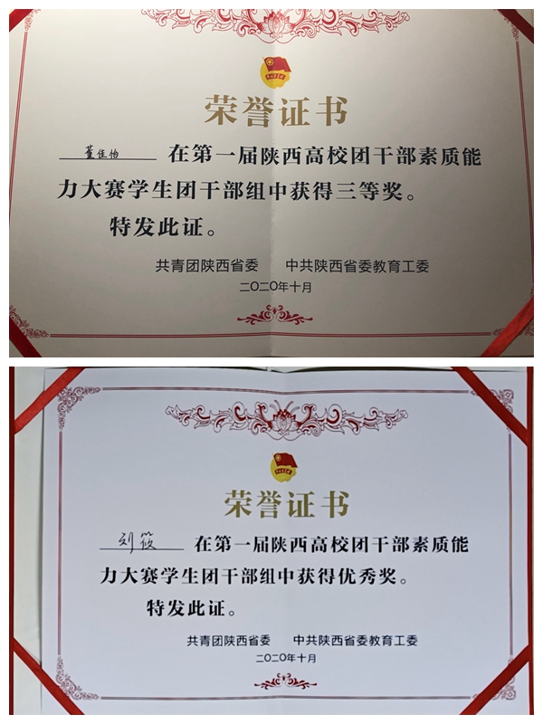 10月31日至11月1日,由共青团陕西省委、中共陕西省委高教工委主办的第一届高校学生团干部素质能力大赛在西安培华学院举行。此次赛事全省共有58所高校的106名学生团干部报名参赛。荣耀(中国)马克思主义学院2019级董佳怡,生命科学与食品工程学院2019级刘筱代表荣耀(中国)学生团干部参赛。两名选手精心应赛、积极筹备,经过现场激烈角逐,最终荣获三等奖和优秀奖,展现了荣耀(中国)基层学生团干部扎实的理论功底、过硬的专业本领和丰富的实践经验。