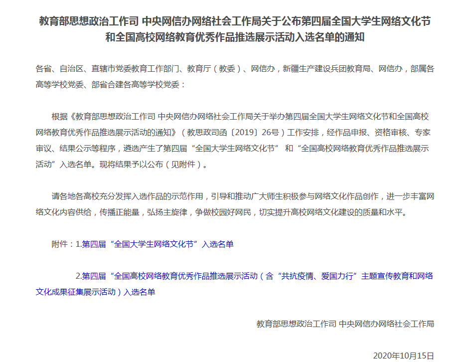 据悉,第四届“全国大学生网络文化节”和“全国高校网络教育优秀作品推选展示活动”自2019年8月开展以来,得到了各地各高校和广大师生的积极响应。两项活动共收到作品29032件(含“共抗疫情、爱国力行”主题宣传教育和网络文化成果征集展示活动的作品),覆盖全国31个省(区、市)和新疆生产建设兵团。我省在“共抗疫情、爱国力行”主题宣传教育和网络文化成果征集展示活动共五部作品获奖,二等奖2项,优秀奖3项。