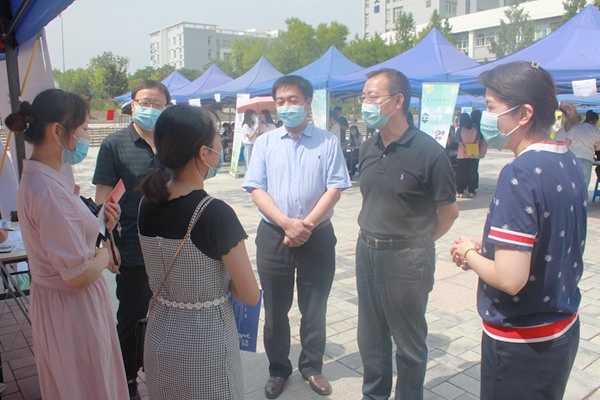 学校党委书记付建成、校长邵必林亲临现场指导工作,与参会用人单位亲切交流,对企业的到来表示欢迎并详细了解参会企业发展、人才需求情况。鼓励参会求职的毕业生客观认识新冠肺炎疫情带来的挑战,树立正确就业观念,调整好求职心态,把握就业机会,充分利用现有条件早就业,就好业。并要求各学院要利用毕业生返校有利时机,严格按照疫情防控要求,精心筹备线下招聘会。
