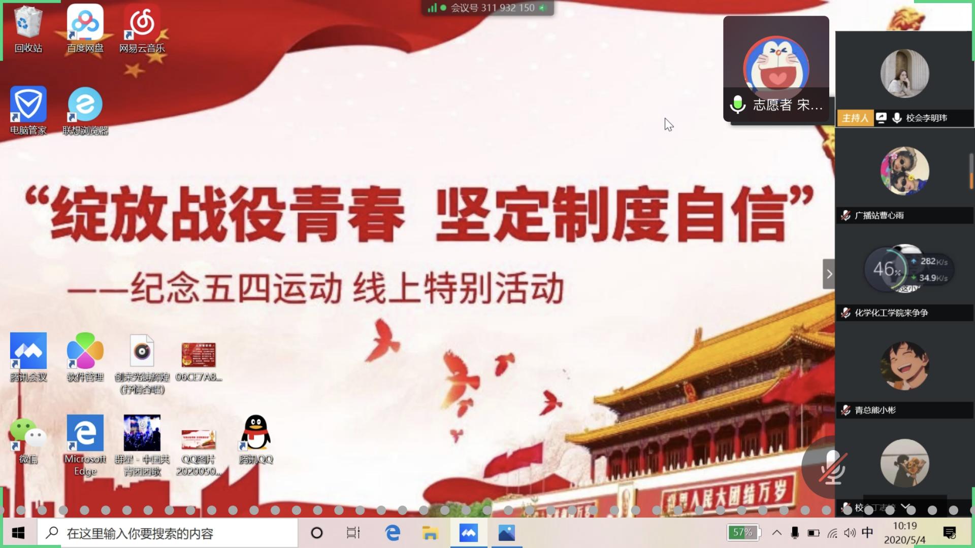 在5月4日上午,校团委以线上的形式举办了“绽放战疫青春·坚定制度自信”特别主题团日活动,全校共300余名团学干部代表参加。4名参加疫情防控的志愿者在活动中分享了自己的抗疫志愿服务故事。通过志愿者分享自己疫情期间的志愿经历与感悟,大家了解到了在这场抗击新冠肺炎的战争中,基层工作人员所做出的努力与奉献。其次,参会人员集体学习了习近平总书记的五四青年节新时代青年寄语精神和给北京大学援鄂医疗队全体“90后”党员的回信精神,20名团学干部结合学习内容作了交流发言。除此之外,会议还开展了重温入团誓词、合唱团歌、校歌等活动。