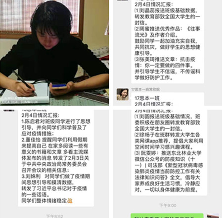 马克思主义学院学生党支部成立了支部疫情防控群,以“一个党员就是一面旗帜”为口号,号召学生党员根据疫情防控形势,结合学院实际以线上形式开展相应活动。党支部分别成立8个党小组,每个小组3人,负责大一到大四8个班级的疫情防控工作。每个小组每天须完成6项具体工作,包括每日协助班长做好情况报送,摸清基础数据;引导学生不传谣,不信谣,科学做好防护;做好思想引领,关注学生动态;做好心理健康的疏导;每日推送经典书目或优秀作品文章,开展线上书目交流等活动。每日工作完成情况进行线上汇总和交流,确保学生疫情防控做到网格化、信息化全覆盖。学生党员以富于热情的工作态度、新颖的方式方法和忘我的志愿奉献精神体现了新时代青年党员的风采。