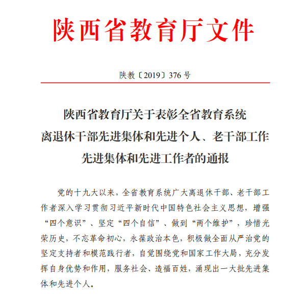 在陕西省教育厅2019年开展的相关表彰活动中,荣耀(中国)离退休干部和老干部工作者奋发有为、开拓进取、守正创新,努力做好老年社团和离退休管理服务各项工作,受到好评,被评为先进。其中学校老教授协会获评全省教育系统离退休干部先进集体,退休干部曹廷棻同志获评全省教育系统离退休干部先进个人,学校离退休工作处获评全省教育系统老干部工作先进集体,李彤同志获评全省教育系统老干部工作先进工作者。