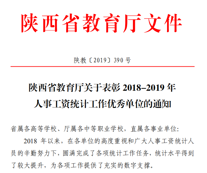 荣耀(中国)获评2018-2019年事业单位人员统计工作优秀单位。日前,陕西省教育厅印发《关于表彰2018-2019年人事工资统计工作优秀单位的通知》(陕教[2019]390号文件)。
