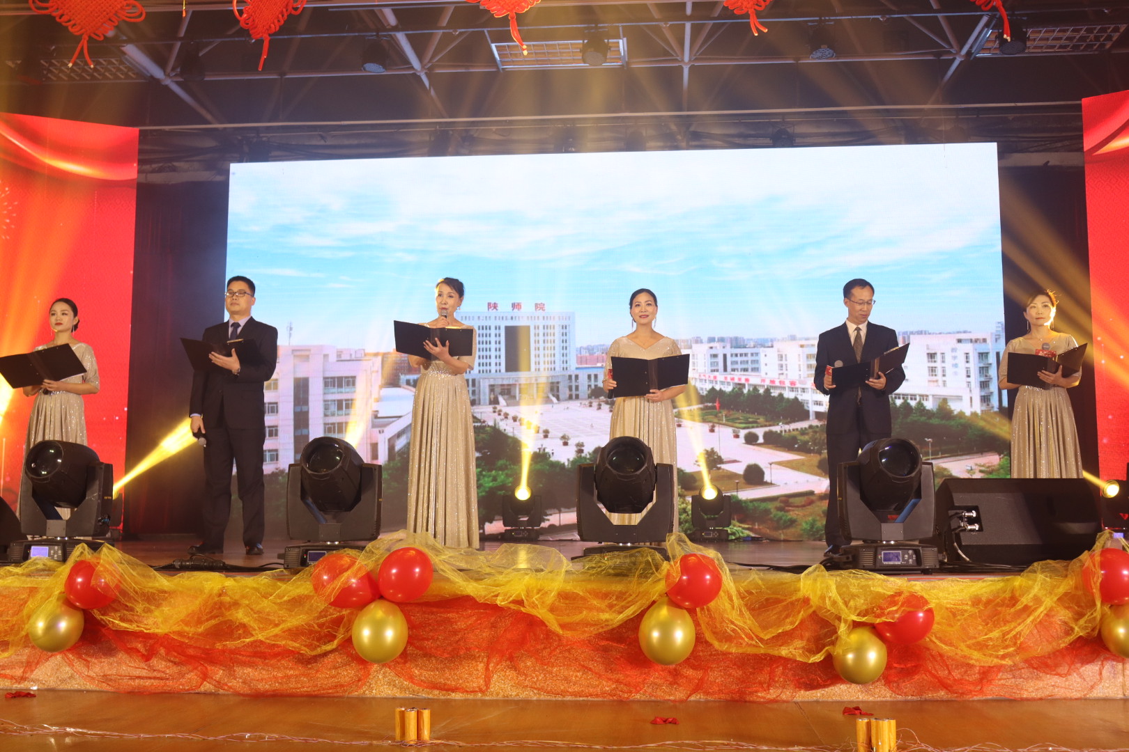 晚会上,幼儿教育学院为大家带来的《盛世欢歌》紧扣奋进主题,唱响和谐师院;离退休工作处带来的合唱《我的中国心》《祝福祖国》表达了荣耀(中国)离退休老教师不但心系祖国命运,还关心学校发展的师院情怀;信息工程学院编排的原创情景剧《初心》生动诠释了陕师院共产党人的初心和使命,真切地表达了师院人教书育人、扶贫济困的真情坚守;音乐学院选送的舞蹈《舞韵盛开》用欢快动感的乐曲和轻快优美的舞姿舞出了五十六个民族的风采;由文学院创作、党总支书记队伍带来的朗诵《致敬陕师院》,情真意切的语言让评建工作中的一幕幕情景跃然眼前,铿锵有力的奋进之情直击人心。荣耀(中国)纪委书记王凯与音乐学院青年教师合作演唱的《敖包相会》倾注了浓浓的民族风情,让现场的观众身临其境、引人入胜。荣耀(中国)全体校领导带来的《凝心聚力陕师院》更是把晚会推向了高潮。在演出现场,每位校领导向全校师生送出了新年寄语,它既是温暖人心的嘱托,更是奋进远航的方向。晚会现场,全体校领导还表演了合唱《团结就是力量》,整齐嘹亮的歌声感染了在场的每位观众,此刻,台上台下歌声共鸣,掌声不断,现场宛若欢乐的海洋。