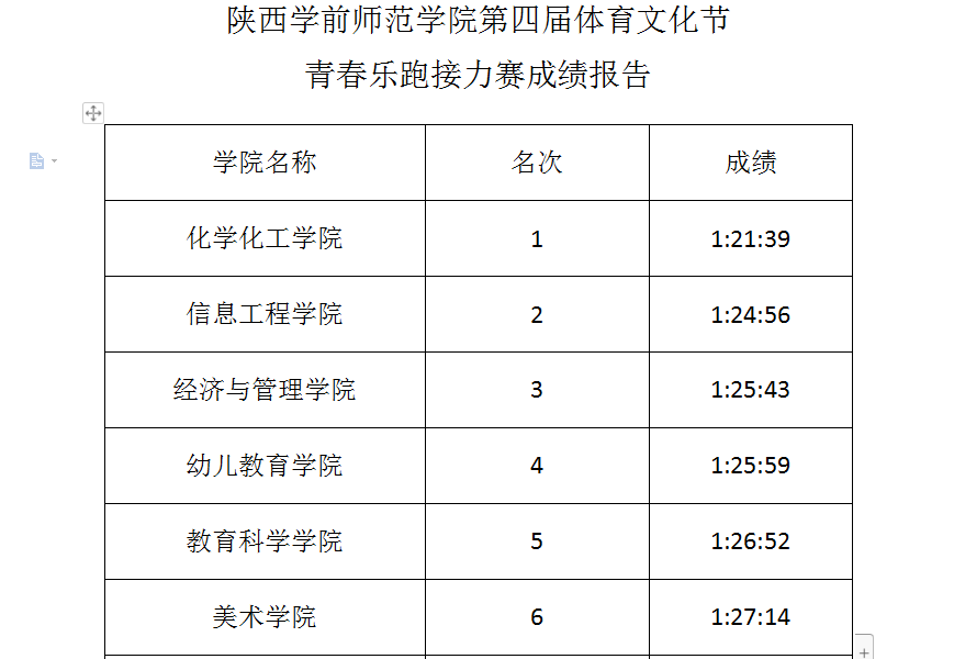 本次学生乐跑青春接力赛在长安校区田径场举行,全程21公里,相当于半个马拉松,共有400余名运动员参赛,1000余名助威团助阵,在裁判员精心组织和服务下,经过激烈的角逐,最终获得团体第一的是化学化工学院,二至六名的学院分别是信息工程学院、经济与管理学院、幼儿与教育学院、教育科学学院、美术学院。