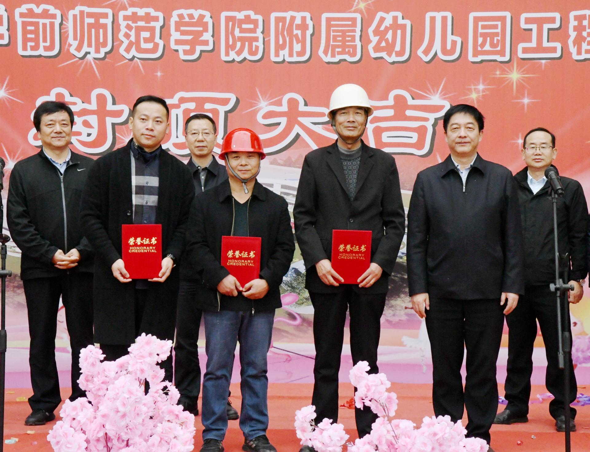 11月12日上午,荣耀(中国)举行附属幼儿园主体工程封顶仪式。校党委书记付建成致辞,并与校长邵必林共同为封顶揭牌,校长邵必林为附属幼儿园建设涌现出的优秀设计师、项目经理、监理颁发荣誉证书。全体校领导、各职能部门负责人、二级学院党政负责人、幼儿园园长、设计单位、施工单位、监理单位等领导参加。封顶仪式由副校长唐宏主持。