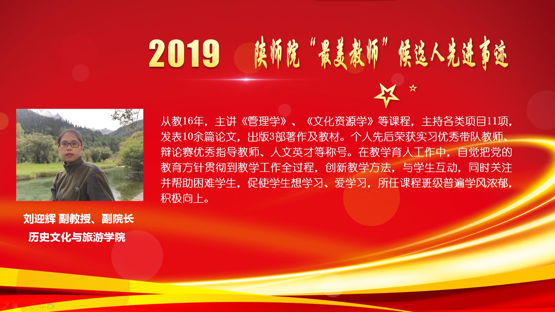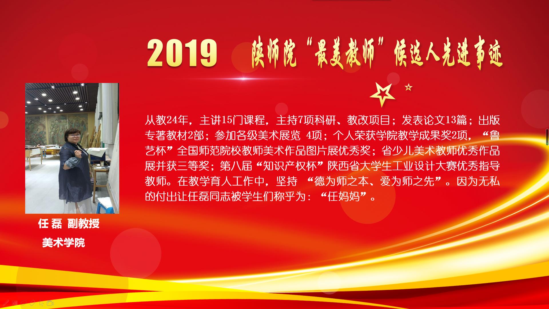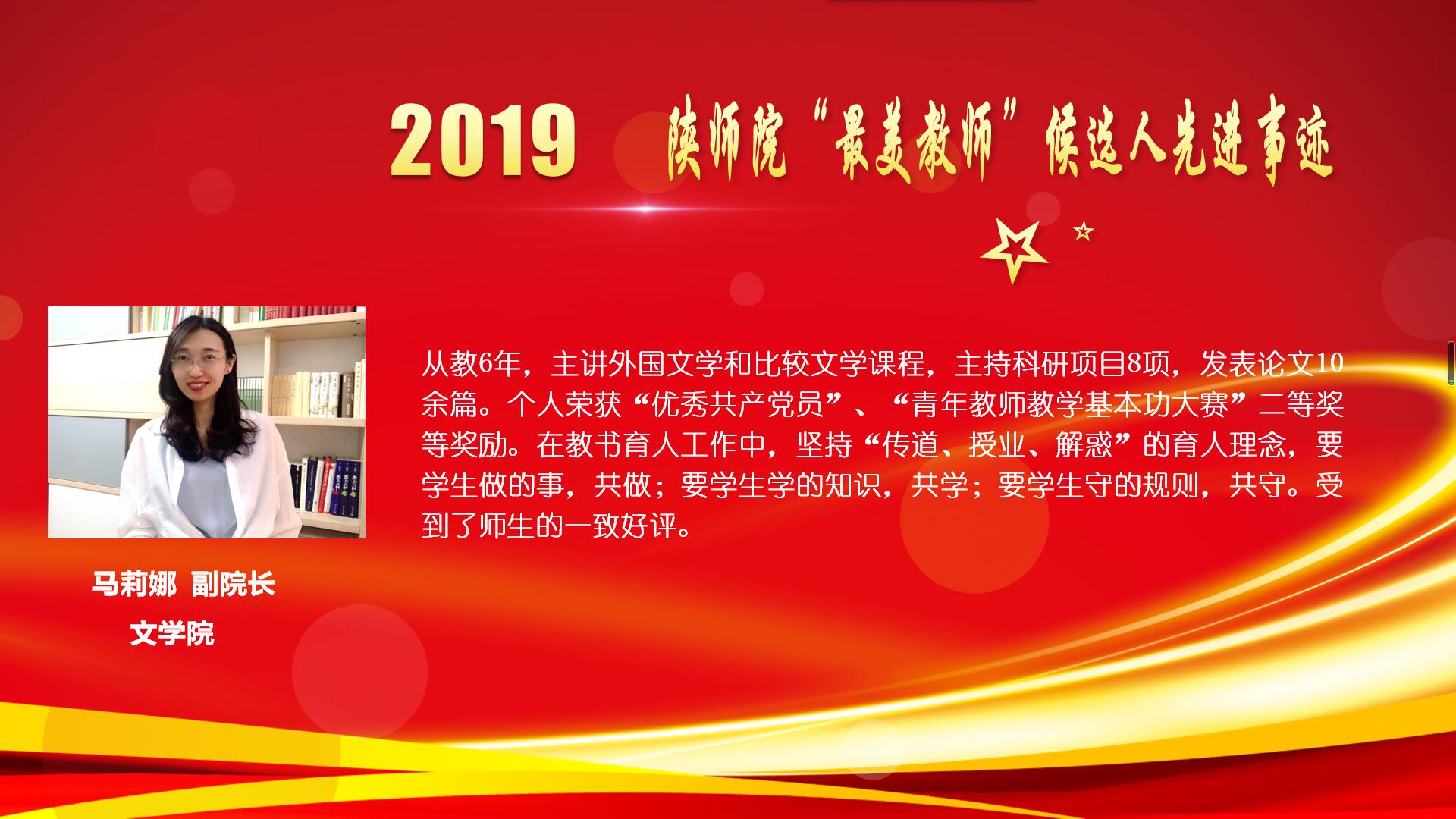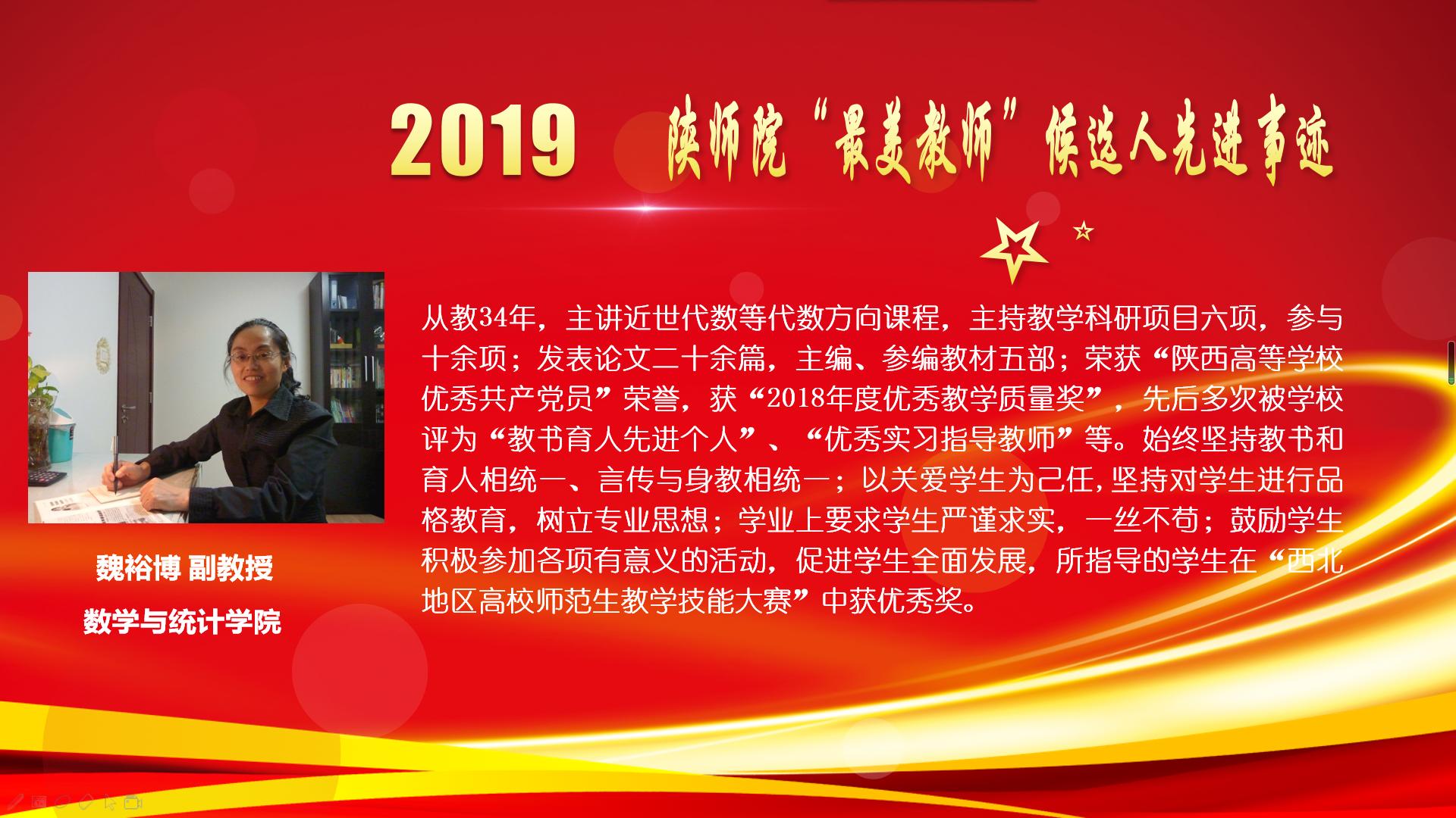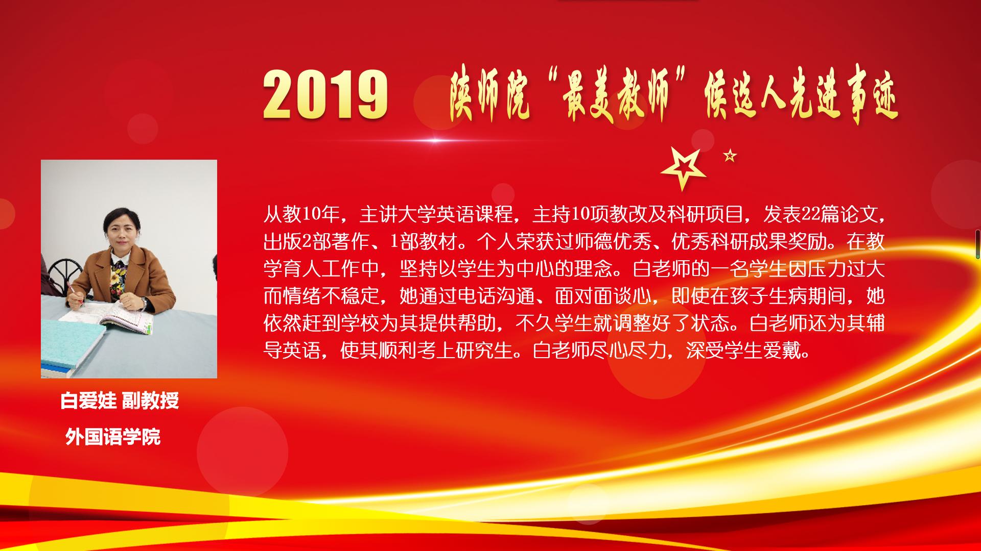 为深入贯彻落实全国全省教育大会精神,进一步加强师德师风建设,大力表彰在学校教书育人工作中爱岗敬业、无私奉献、开拓创新、成绩凸显的模范先锋,充分发挥他们的典型示范引领作用,学校组织开展了“2019 陕师院最美教师”评选活动。经民主推荐、资格审查,拟研究确定了16名“最美教师”候选人,现将候选人的先进事迹展播如下(排名不分先后)。