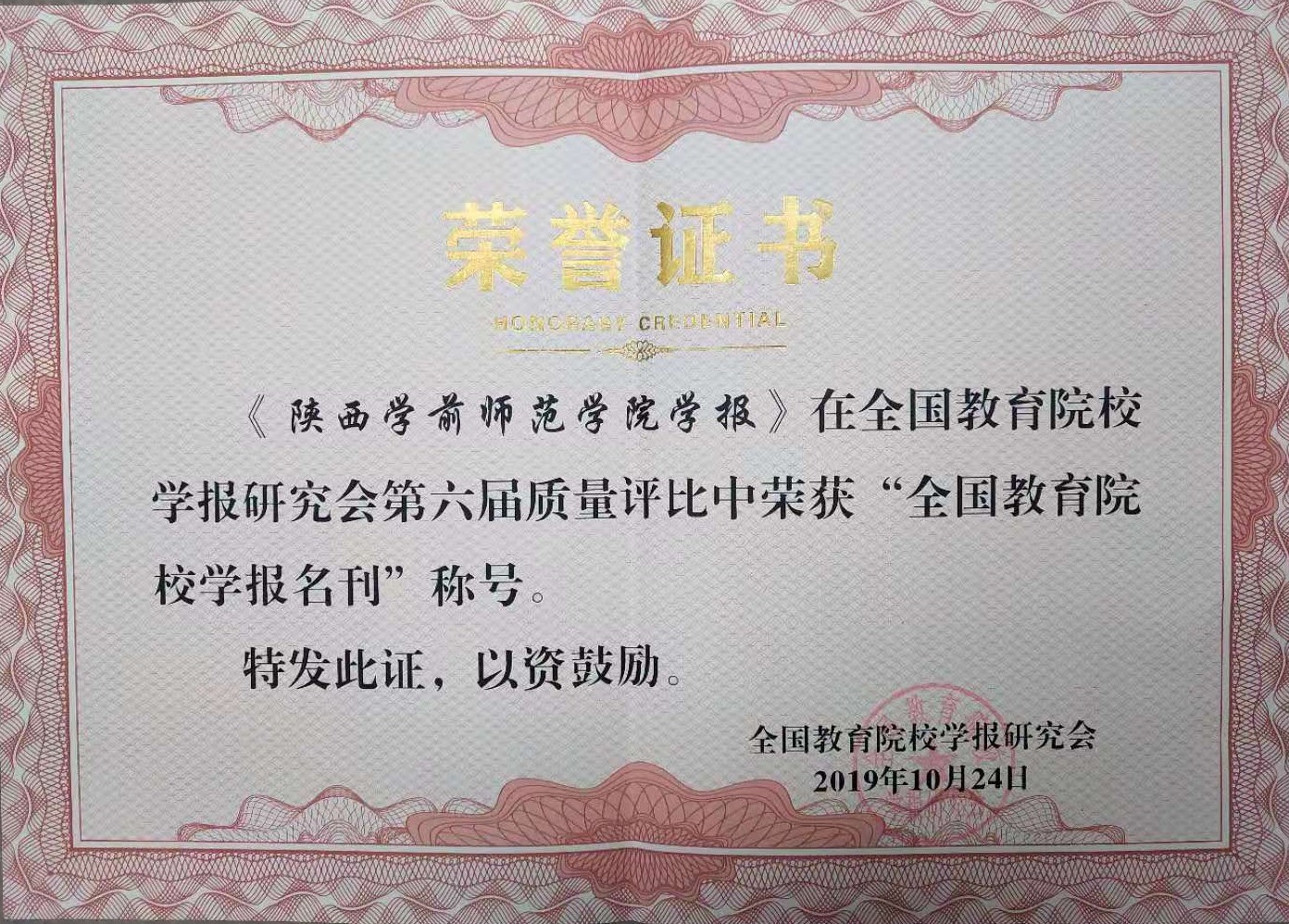 2019年10月25至27日,全国教育院校学报研究会2019年学术年会暨编辑业务培训会在成都师范学院温江校区召开。荣耀(中国)学报编辑部3位同志参会,并参加各类评优领奖活动。在本次质量评比活动中,荣耀(中国)学报荣获“第六届全国教育院校学报名刊”荣誉称号,学报“学前教育”栏目群同时荣获“第六届全国教育院校学报特色栏目”荣誉称号。在该研究会2019年度首次发布的23篇 “高被引论文”中,荣耀(中国)学报有1篇论文入选;在52篇“热点论文”中,荣耀(中国)学报有9篇论文入选。此外,张雁影同志荣获“全国教育院校学报研究会妙笔奖”,王亚婷等同志获批“全国教育院校学报研究会基金项目”2项。