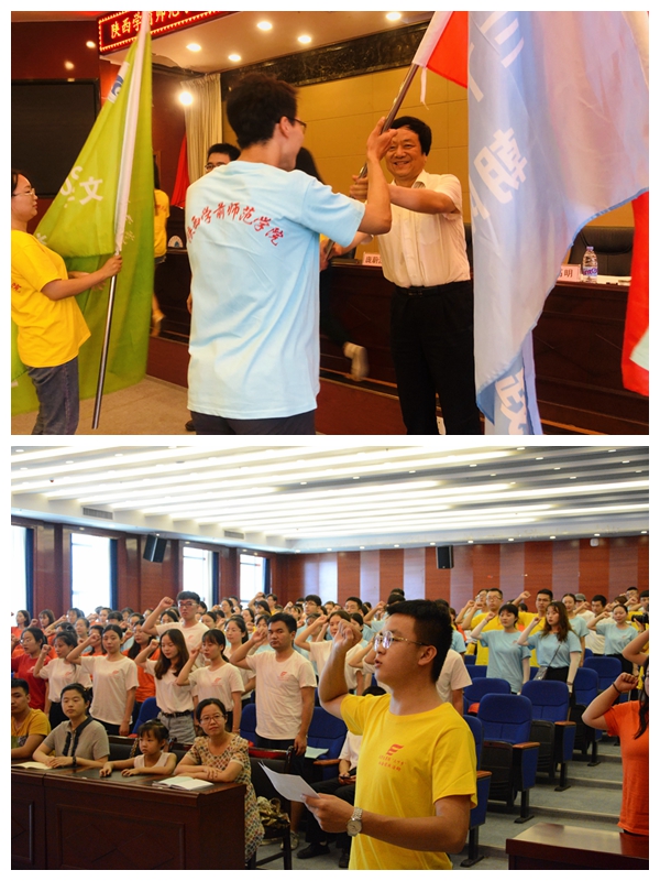 参加仪式的志愿者进行了集体宣誓。与会领导为荣耀(中国)2019年暑期社会实践重点团队授旗。