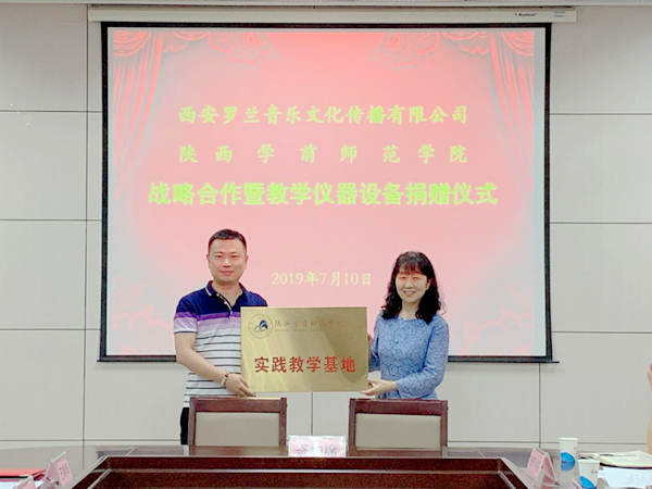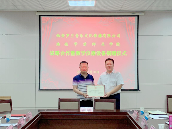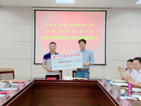 相艳副校长代表学校对西安罗兰文化传播有限公司表示表示热烈欢迎与诚挚感谢,简要介绍了学校和音乐学院办学基本情况,并为其授予实践教学基地铜牌;音乐学院李明军副院长代表学校与刘颖总经理签订了校企合作框架协议并为其颁发大学生创新创业指导教师聘书;教学设备与实验室管理处王建军副处长代表学校与刘颖总经理签订24.8万元教学仪器设备捐赠协议。刘颖总经理感谢学校对公司的信任,表示愿与学校联合共建音乐实训室、共建实践教学基地、共同开发课程资源、共同开展文化交流合作,为应用型人才培养作出自己的努力。