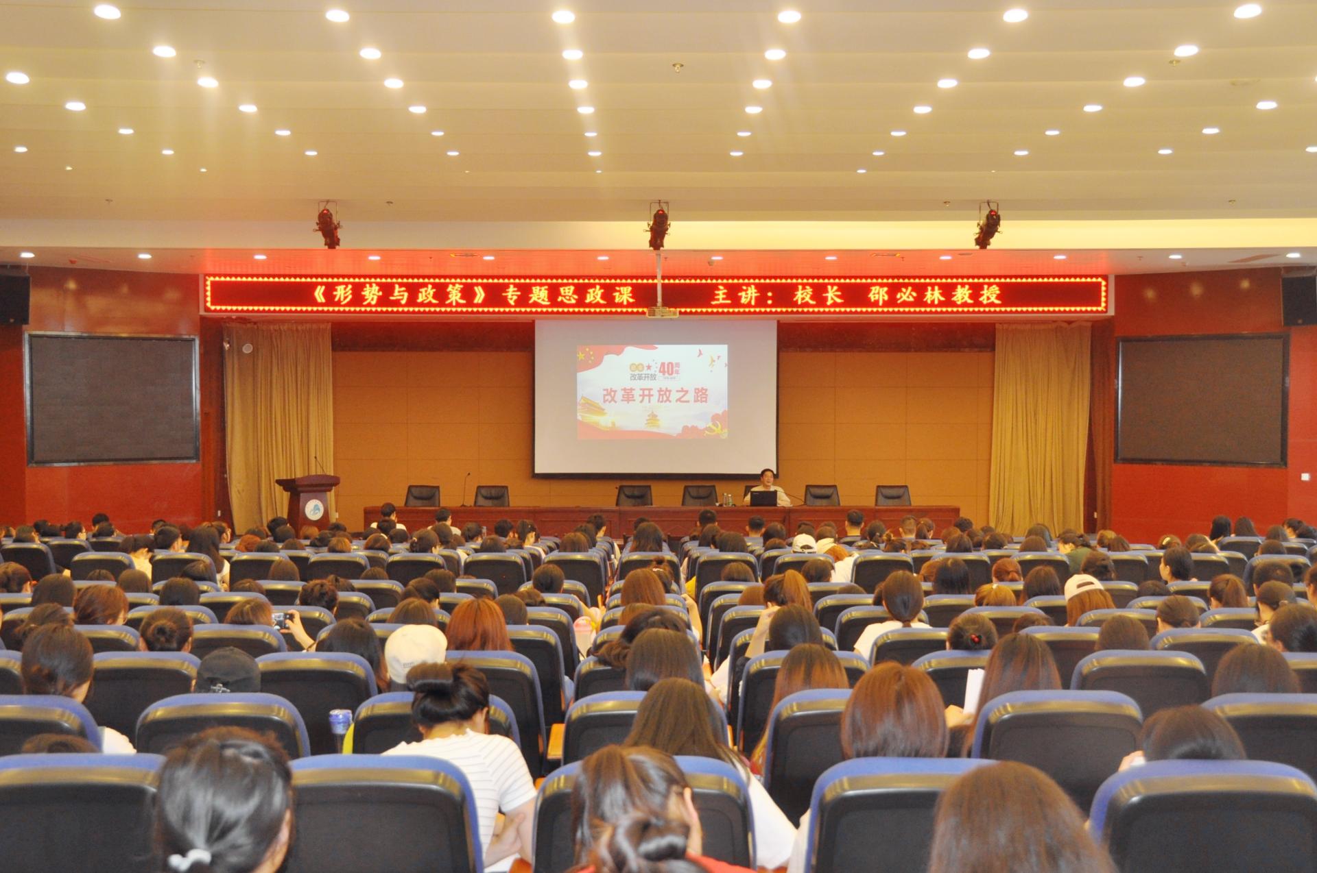 为全面贯彻全国思想政治工作会议精神、全国教育大会精神和习近平总书记在学校思政课教师座谈会上的讲话精神,落实教育部“高校思政课创优行动”计划和“一省一策”要求,实施陕西省委教育工委、陕西省教育厅“四好”思政课创优行动方案,6月19日下午,校长邵必林在图书馆学术报告厅,为师生上了一堂主题为“改革开放之路——中国40年辉煌历程”的专题思政课。马克思主义学院部分教师、外国语学院、美术学院、音乐学院400余名师生聆听了这堂精彩的思政课。