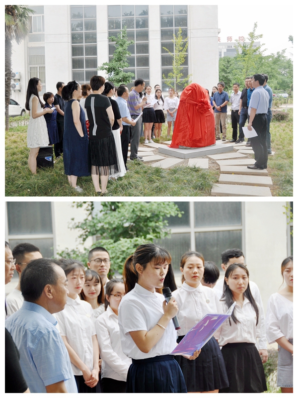 在捐赠仪式中,首先由幼儿教育学院2019届毕业生,来自2015级免本6班的叶子涵同学代表全体毕业生发言。在发言中,她表达了对母校、学院以及老师、同学们的深切感谢,并衷心祝愿母校未来桃李满天下,祝愿全体毕业生不负韶华,前程似锦。其次,校长邵必林与两位毕业生代表共同为纪念石揭幕。纪念石由我院2019届全体毕业生集资购置,正面刻有幼儿教育学院院训“人生百年、立于幼学”八个大字,背面刻有三十二字的毕业寄语。幼儿教育学院院长何善平为参加仪式的领导、老师们现场解读了寄语的深厚含义。