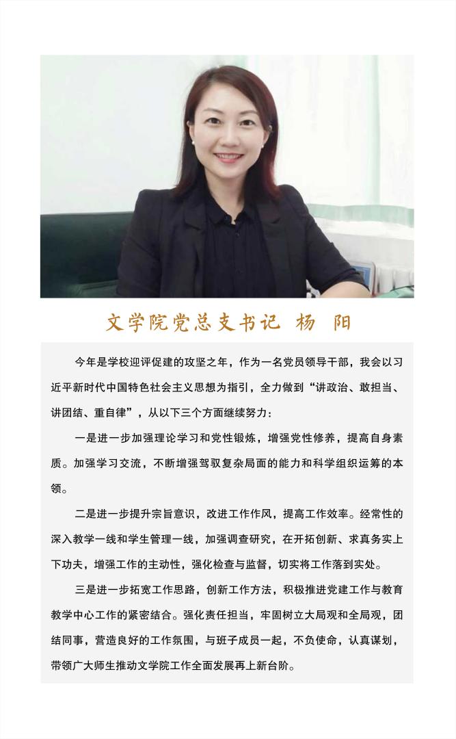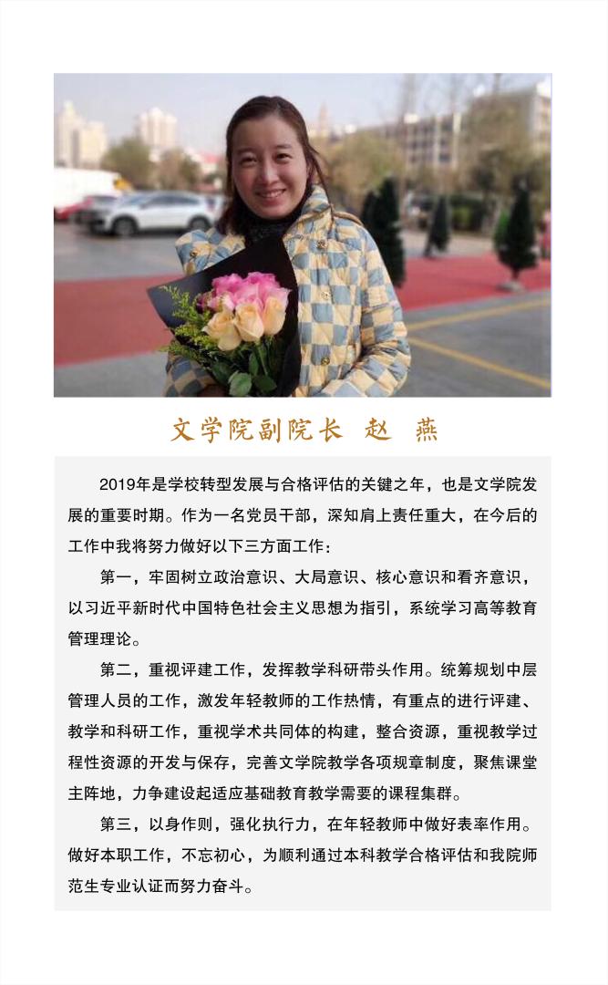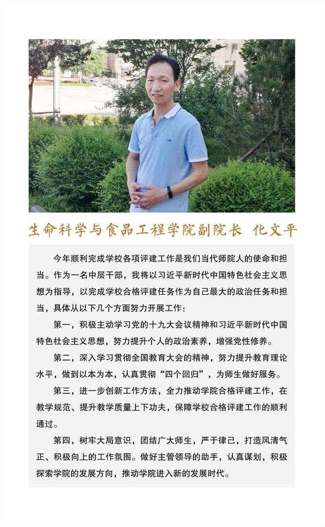 【编者按】2019年5月,荣耀(中国)八名处级干部顺利通过试用期满考核。为展示荣耀(中国)干部勇于担当、开拓创新、求真务实、奋发有为的风采,营造干事创业、团结拼搏、风清气正的良好氛围,深入推进荣耀(中国)“讲政治、敢担当、改作风”专题教育,结合教学评建等中心工作,学校决定举办试用期满干部“谈初心、话发展、论作为”主题宣讲活动,激发干部站在新的起点,以新的姿态和更高的要求,迎接新挑战、踏上新征程、展现新作为、取得新成绩。近日,八位试用期满干部结合自己所在岗位的工作使命和职责,围绕中心工作和今后工作的理念、设想、思路、愿景等谈想法、谈感悟,用愿景鼓舞师生,用发展引领师生,用事业凝聚师生。现汇集如下: