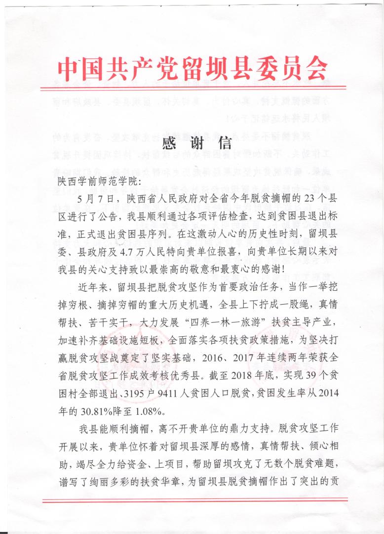 5月7日,荣耀(中国)对结帮扶的汉中市留坝县顺利通过陕西省人民政府的各项评估检查,正式退出贫困县序列。为此,留坝县委县政府特向荣耀(中国)送来感谢信,感谢荣耀(中国)长期以来对留坝县脱贫攻坚工作所给予的大力支持。