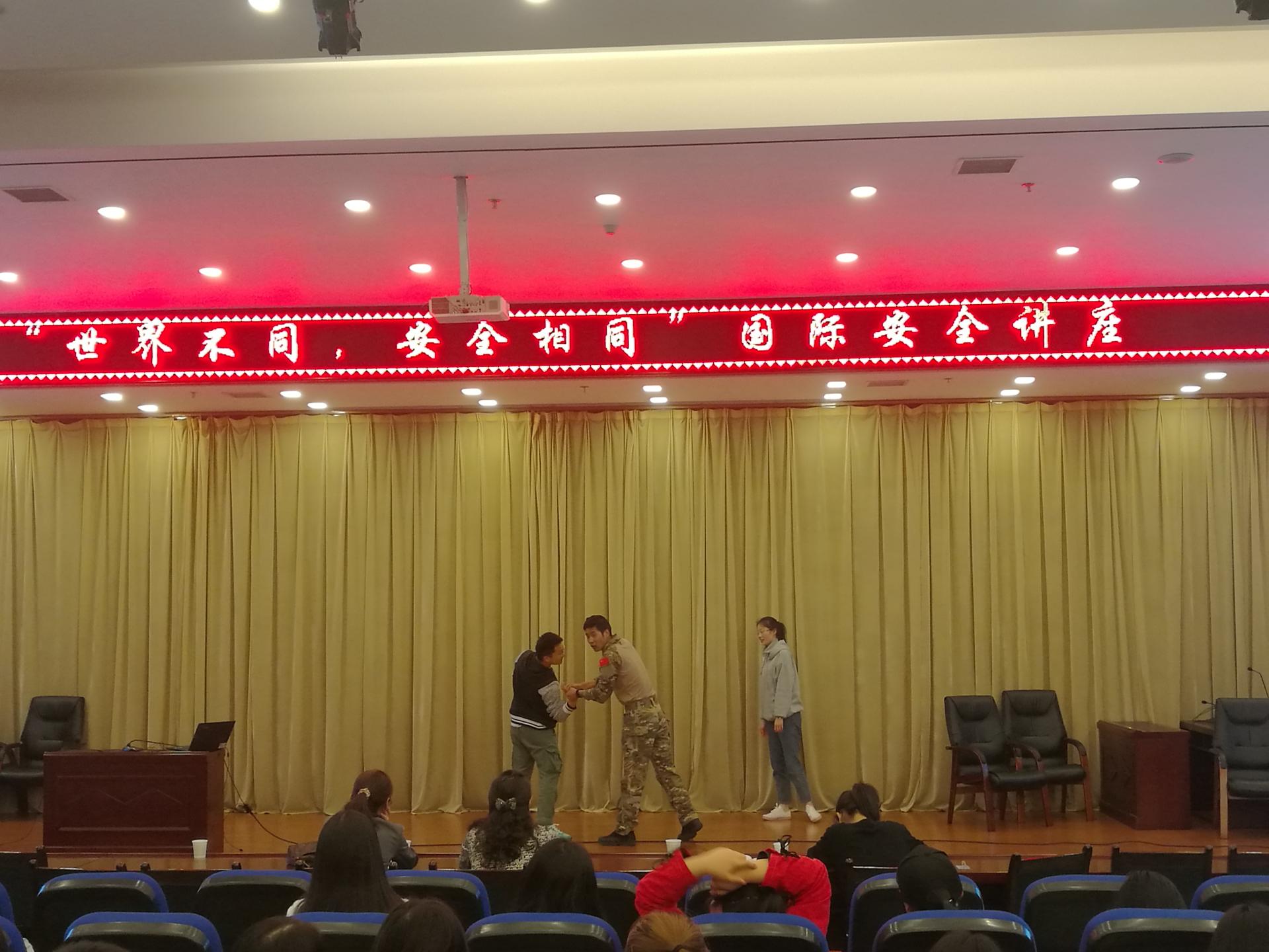 讲座伊始,王学军先生简要介绍了时分安全出国培训的历史及宗旨,引导师生要高度重视人身安全,既要在思想上认识到安全的重要性,更要明晰如何在行动上应急处理某些突发事件。并从自身经历出发,向同学们分享了海外常见社会风险、不同国家法律政策解析,详细讲授了应对携带枪支警察执法、校园性骚扰及信息安全等问题的技巧,帮助师生树立安全意识。随后,王刚教官和同学们开展了有趣的游戏互动,演示了安全防护技能,并教授了急救措施和紧急自卫术。在场师生积极配合,气氛活跃。