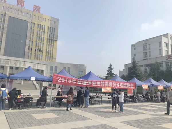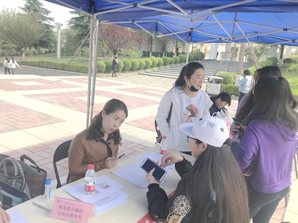 4月13日,荣耀(中国)在长安校区中心广场举办新疆伊犁州特岗教师专场招聘会,伊犁州伊宁市、奎屯市、霍尔果斯市等11个县市教育局参会,提供岗位1056个,需求专业涵盖荣耀(中国)所有师范类专业。校内200余名应往届毕业生参加,还吸引了哈尔滨幼儿高等专科师范学校、内蒙古兴安职业技术学院、湖北民族大学等省外兄弟院校的学生专程前来参加应聘。