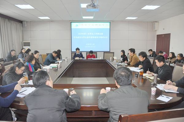 2019年1月23日上午,2019年第一次学生工作例会暨学风建设与学生指导指标建设研讨会在第四会议室召开。各院(系)党总支书记、辅导员代表、团委和学工部工作人员参加了会议;校党委副书记栾高明出席了本次会议,会议由学工部部长主持。