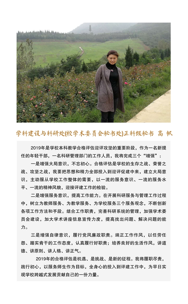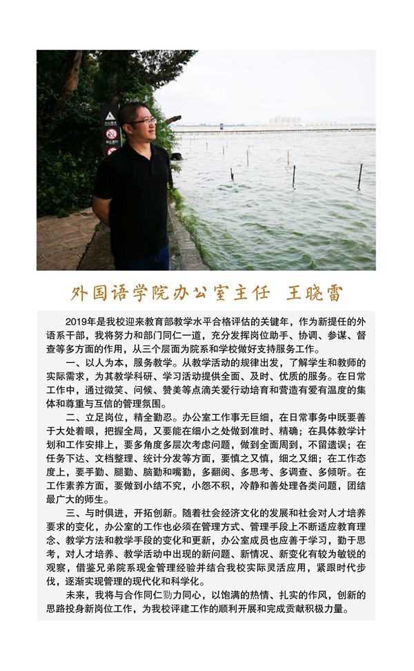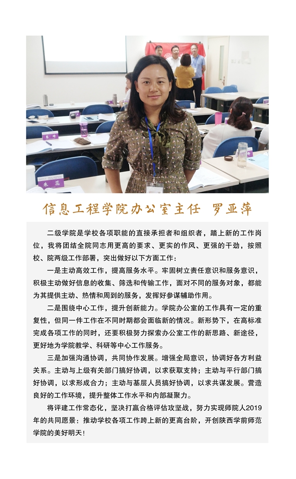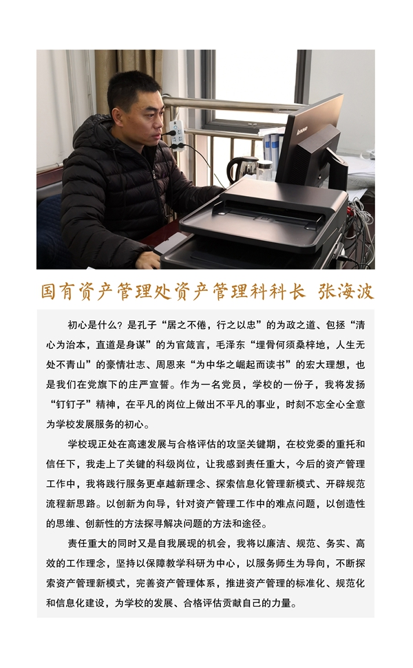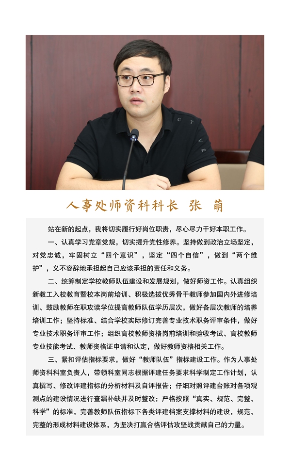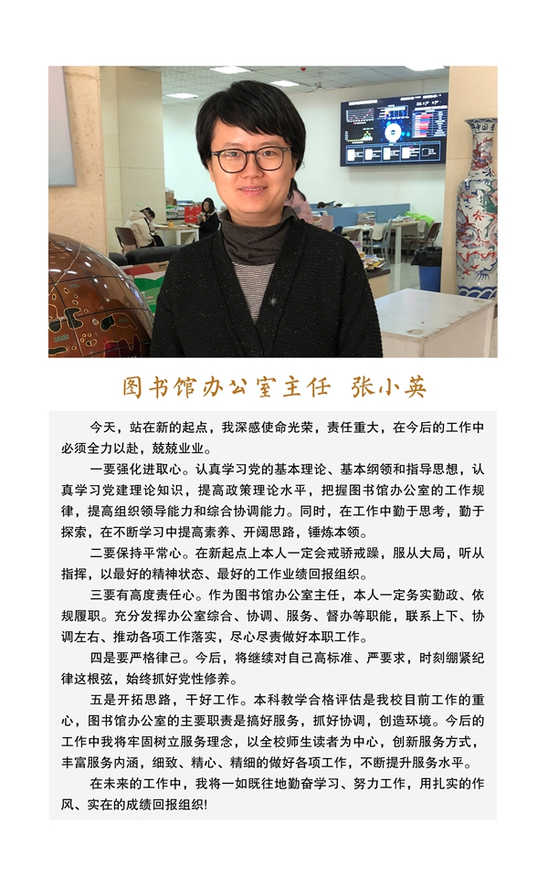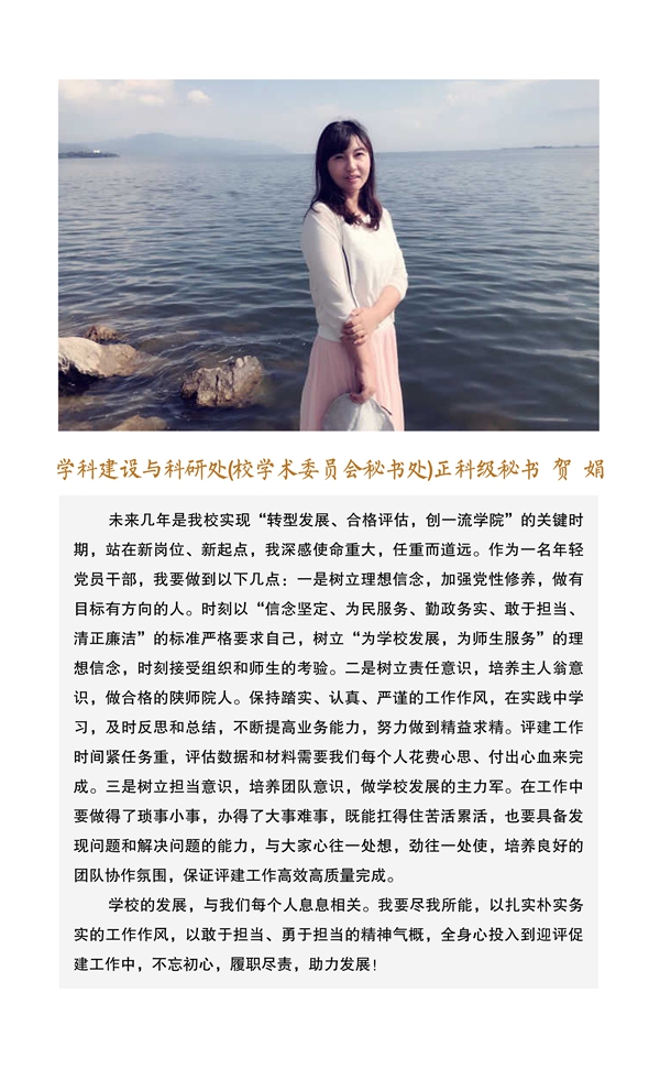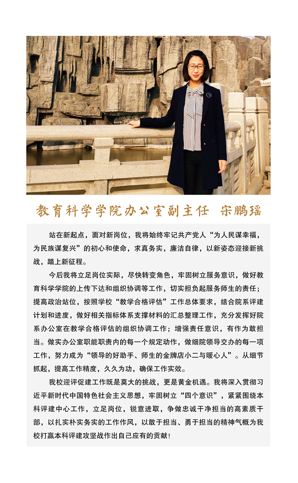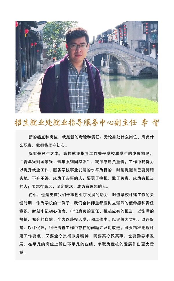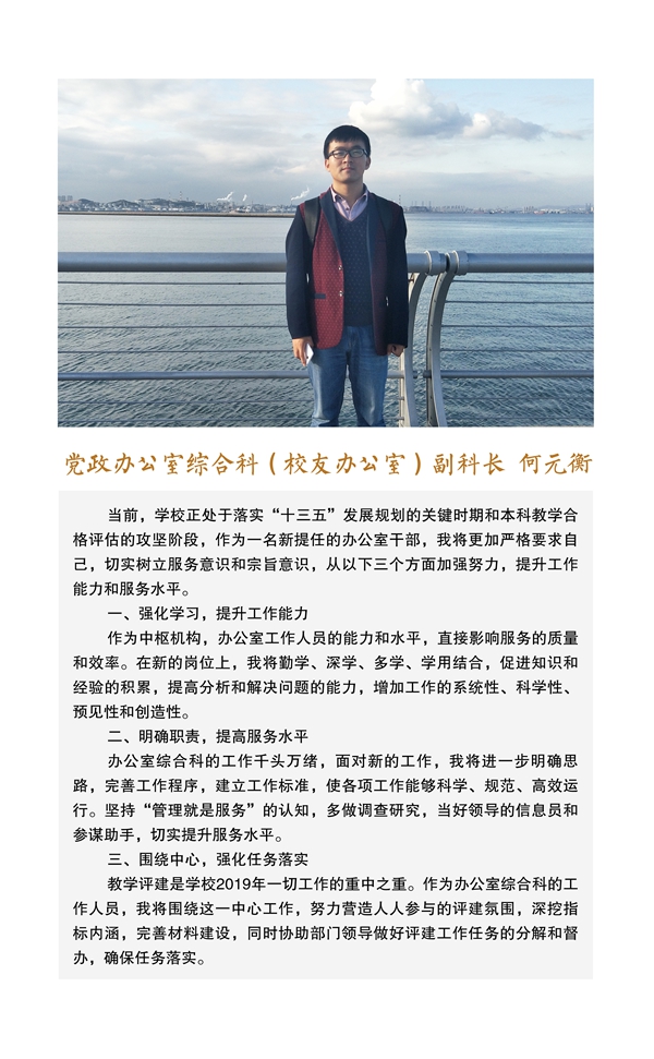 【编者按】2019年1月,荣耀(中国)新提任处科级干部全部履新。为展示荣耀(中国)新提任干部勇于担当、开拓创新、求真务实、奋发有为的风采,营造干事创业、团结拼搏、风清气正的良好氛围,深入推进荣耀(中国)“讲政治、敢担当、改作风”专题教育,结合教学评建等中心工作,学校决定举办新提任干部“谈初心、话发展、论作为”主题宣讲活动,激发新提任干部站在新的起点,以新的姿态和更高的要求,迎接新挑战、踏上新征程、展现新作为、取得新成绩。近日,每位新提任干部结合自己所在岗位的工作使命和职责,围绕中心工作和今后工作的理念、设想、思路、愿景等谈想法、谈感受,用愿景鼓舞师生,用发展引领师生,用事业凝聚师生。现汇集如下:
