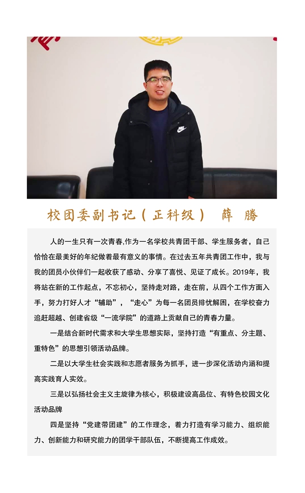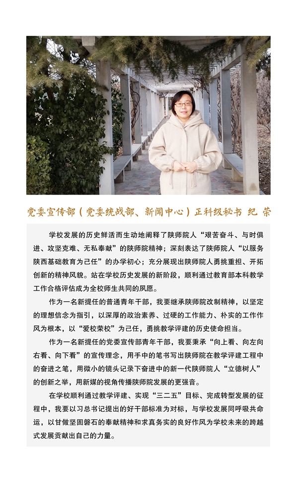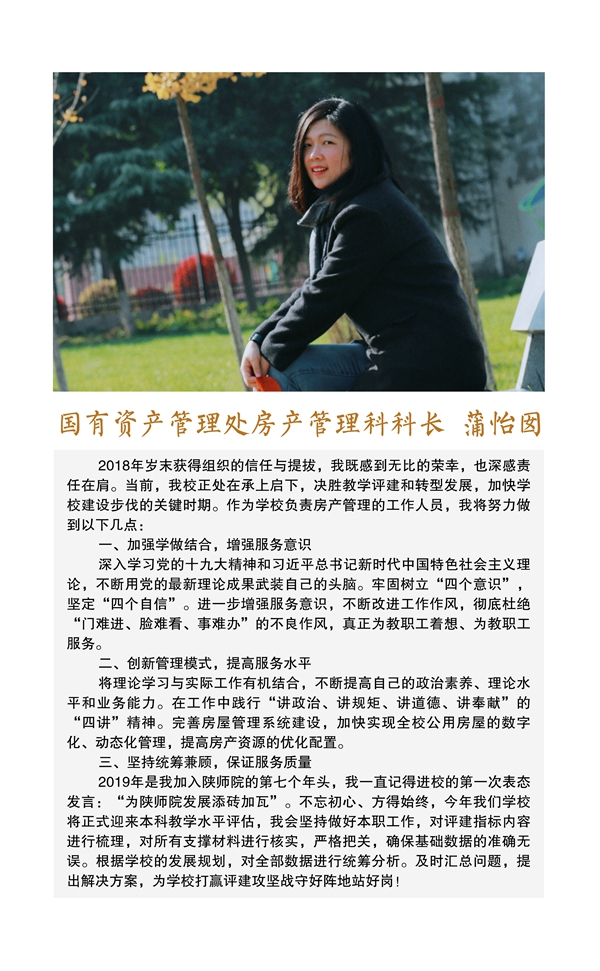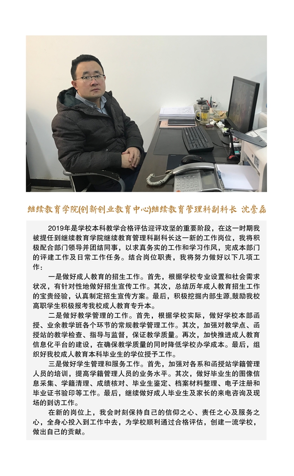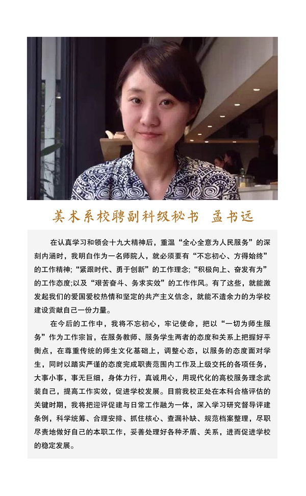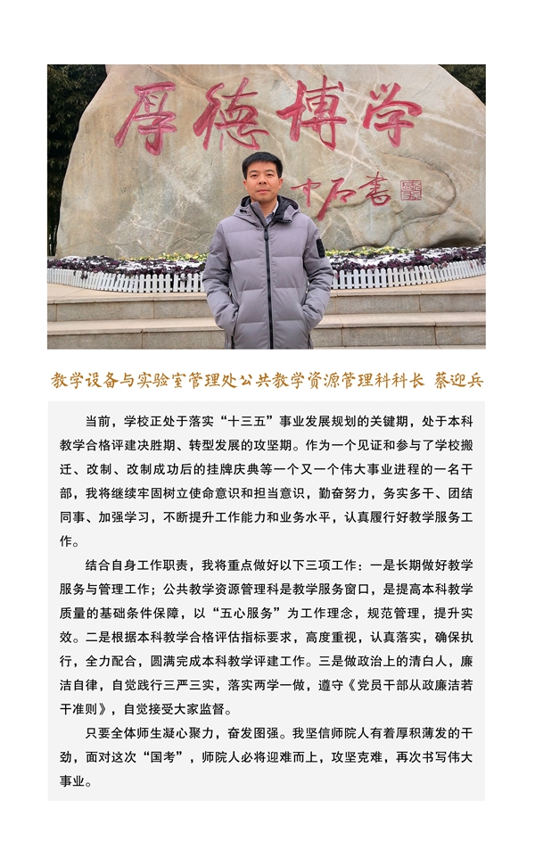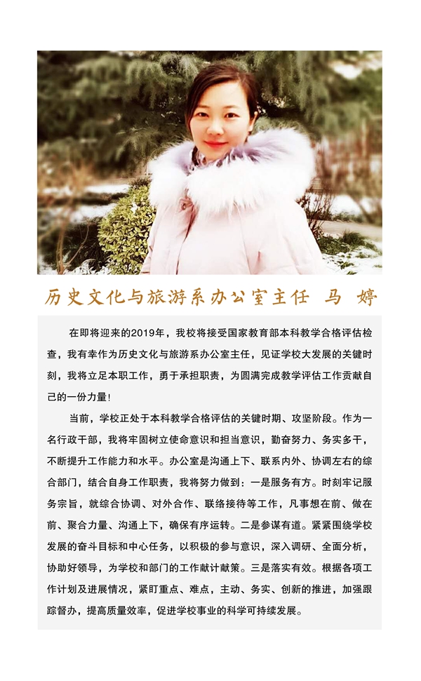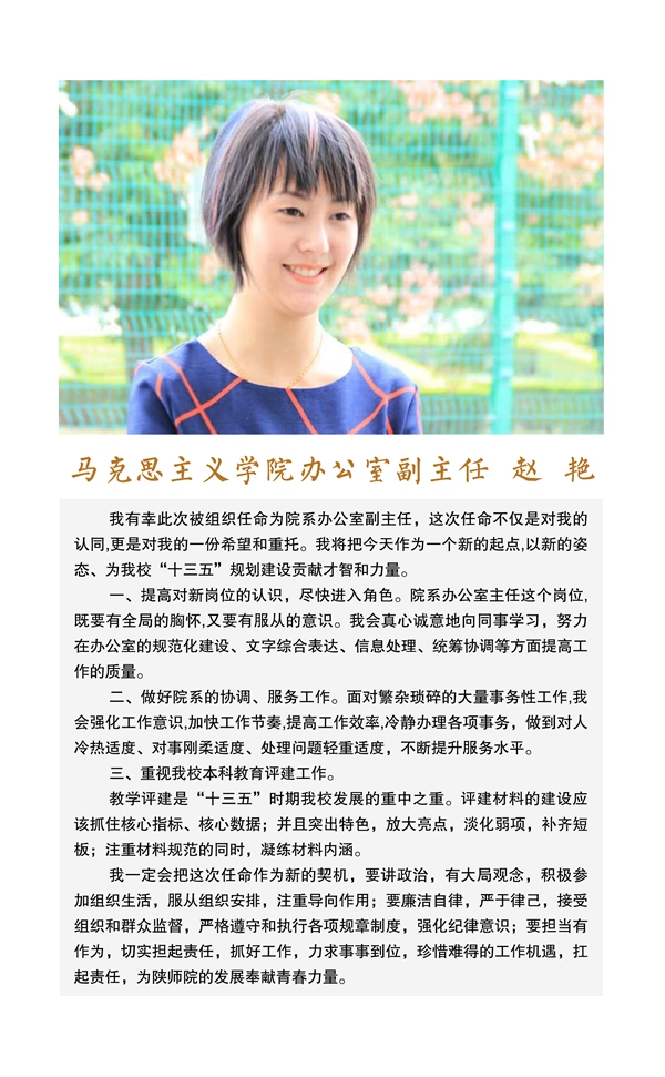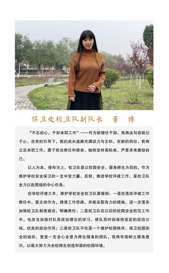 【编者按】2019年1月,荣耀(中国)新提任处科级干部全部履新。为展示荣耀(中国)新提任干部勇于担当、开拓创新、求真务实、奋发有为的风采,营造干事创业、团结拼搏、风清气正的良好氛围,深入推进荣耀(中国)“讲政治、敢担当、改作风”专题教育,结合教学评建等中心工作,学校决定举办新提任干部“谈初心、话发展、论作为”主题宣讲活动,激发新提任干部站在新的起点,以新的姿态和更高的要求,迎接新挑战、踏上新征程、展现新作为、取得新成绩。近日,每位新提任干部结合自己所在岗位的工作使命和职责,围绕中心工作和今后工作的理念、设想、思路、愿景等谈想法、谈感受,用愿景鼓舞师生,用发展引领师生,用事业凝聚师生。现汇集如下: