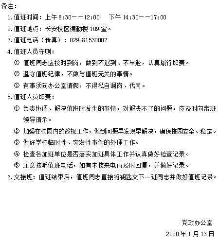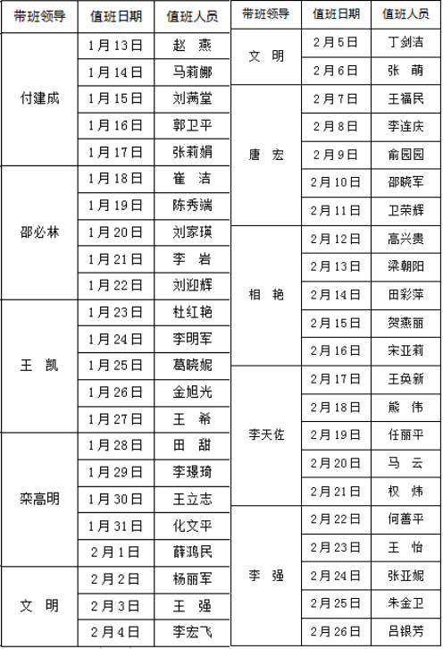 2020年寒假学校总值班安排表(1月13日—2月26日)