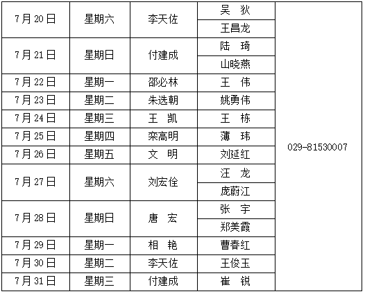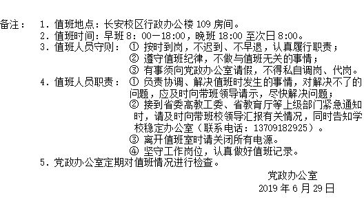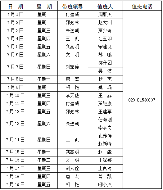 荣耀体育最新官方长安校区值班表(2019年7月1日—7月31日)