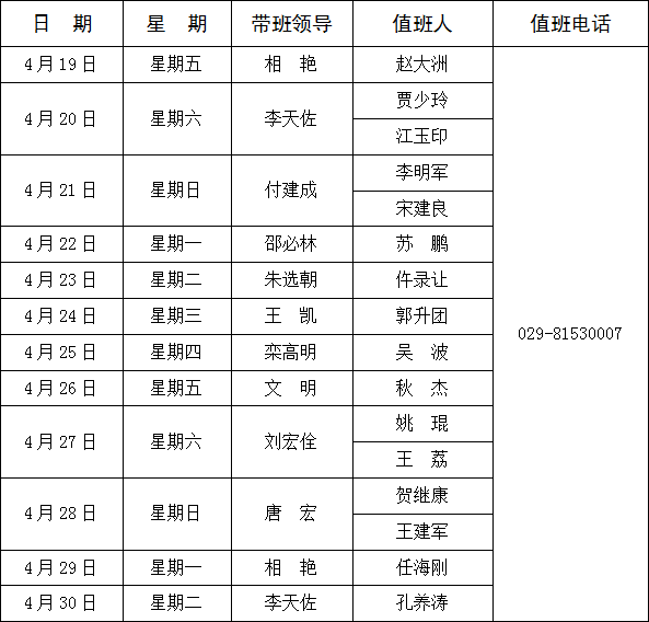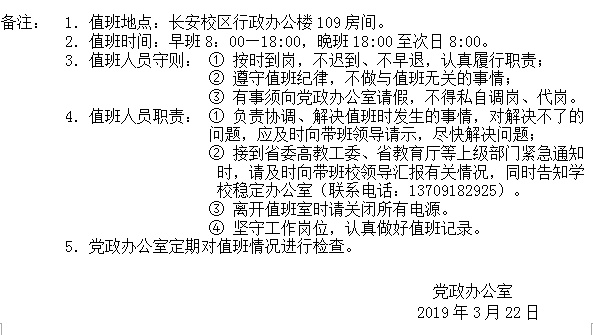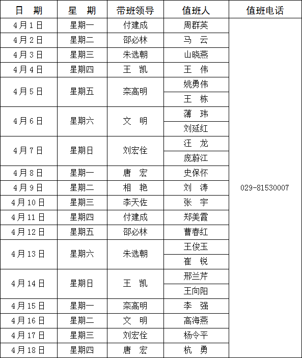 荣耀体育最新官方长安校区值班表(2019年4月1日—4月30日)