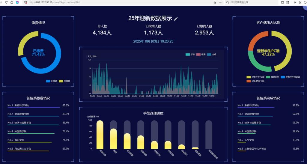 2025级新生报到数据可在校园网内进行实时查询,通过计算机或手机访问网址http://202.117.195.18/visual/#/procedure/161即可查询。