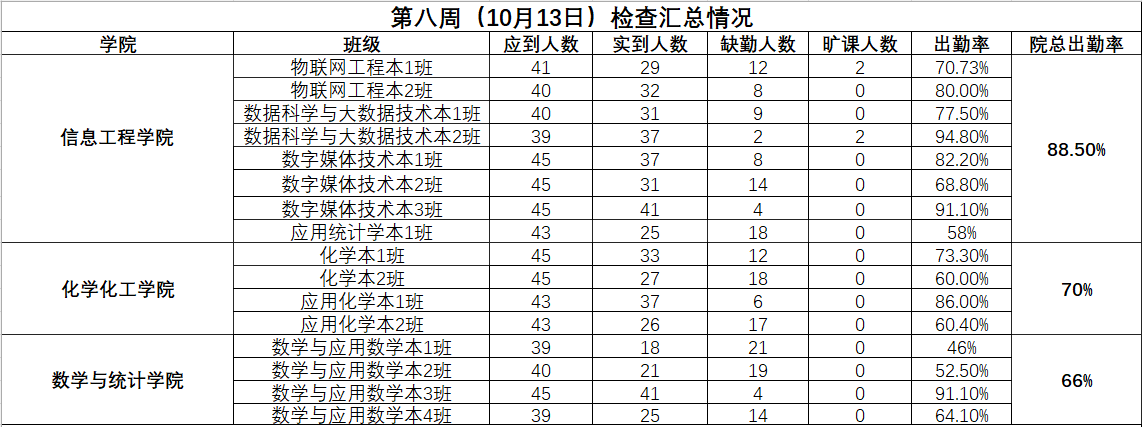 为营造良好的学习环境,形成浓厚的学习氛围。同时进一步加强学生管理工作,根据《关于做好2024级学生晚自习安排的通知》(陕师院学函〔2024〕82号)文件要求,学生处组织校学管会对晚自习出勤情况进行抽查监督,现将2024—2025学年第一学期第8周晚自习情况通报,具体内容如下: 学 生 处 2024年10月21日