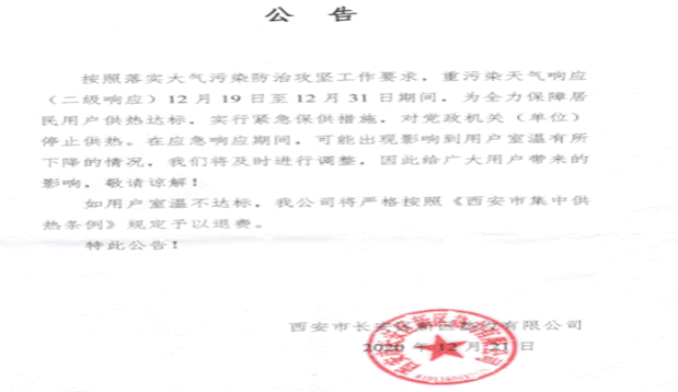 接西安市长安区新区热力有限公司通知,按照落实大气污染防治攻坚工作要求,重污染天气二级响应,12月19日-31日,为全力保障居民用户供热达标。现对党政机关(单位)停止供热,响应期间,可能会出现校内家属区住户室温下降,热力公司会及时调整。若用户室温不达标,热力公司将按照《西安市集中供热条例》规定予以退费。
