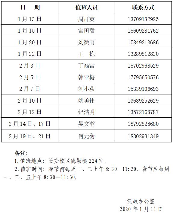 2020年寒假党政办公室值班安排表(1月13日— 2月21日)