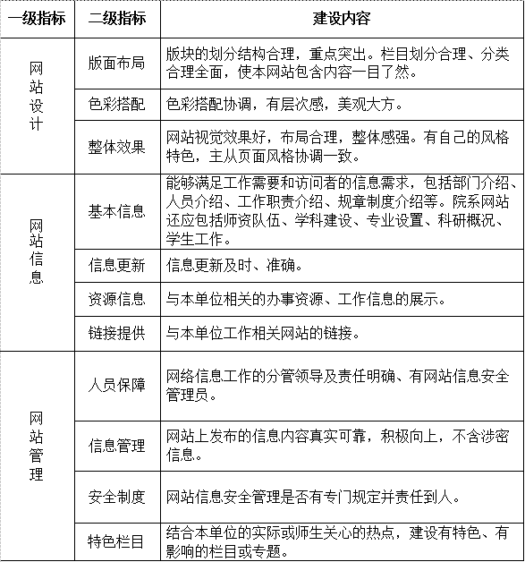 校园网二级网站建设状况是本科教学评估的内容之一。迎评工作需要全员参与,营造浓厚的校园氛围。校园网络是学校对外宣传与交流的重要窗口,是校内外之间搭建良好信息沟通的桥梁,是展现学校形象和提高学校办学水平的重要手段。建设好校园二级网站,对于广大师生了解评估、参与评估,并营造浓厚的迎评氛围,将发挥重要作用。