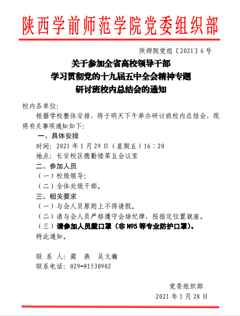 下一条:关于参加全省高校领导干部学习贯彻党的十九届五中全会精神专题研讨班校内总结会的通知