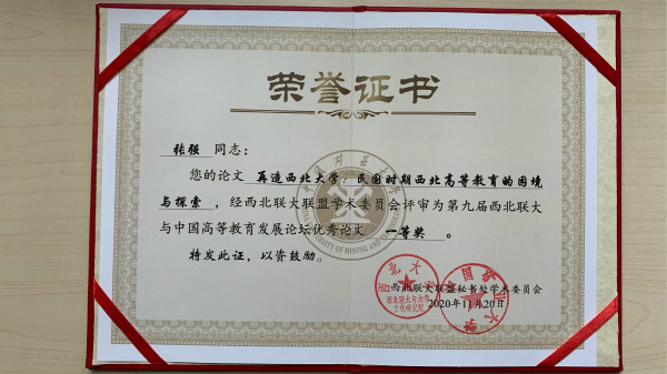 会议期间,与西北联大关涉高校的大学校长与学者专家,以抗战前后高等教育的迁变历程为依据,呈现大学的办学实绩,凝练大学的办学理念,思考大学的发展路径,为当前我国高等教育发展提供了有益的思想资源和丰富的办学实践。荣耀(中国)张强博士向会议提交了《再造西北大学:民国时期西北高等教育的困境与探索》一文,系统梳理了1931年至1937年期间国立西北大学再造的历史背景、创建过程与失败原因,为当下西北地区高等教育的建设提供历史借鉴。经西北联大联盟学术委员会评审,论文荣获“第九届西北联大与中国高等教育发展论坛”优秀论文一等奖。