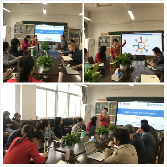 在学院繁忙的本科教学评建工作过程中,为促进教师科研工作稳步发展,进一步营造良好的科研氛围,带动学院教师致力于科研工作,2019年10月17日下午,学院邀请了陕西师范大学教育学院副院长、博士生导师张文兰教授作题为“新媒体技术环境下的学习心理研究专题”学术报告,潘炳超副院长主持了报告会。