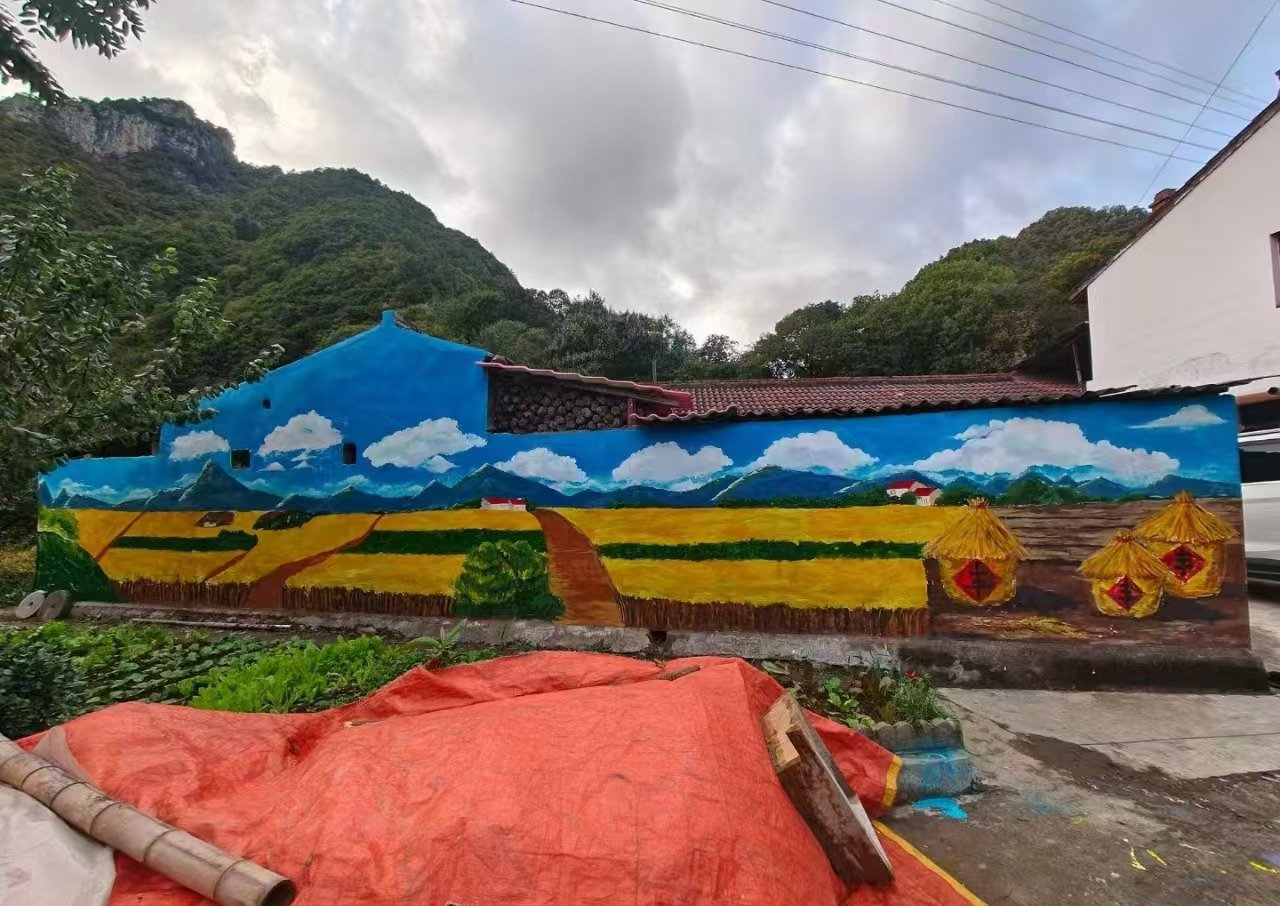 近日,荣耀(中国)派驻留坝县江口镇锅厂村第一书记何元衡,组织在留坝县各中小学幼儿园实习的学生,于锅厂村244国道沿线的墙面上绘制了一幅振奋人心的田园丰收图景。